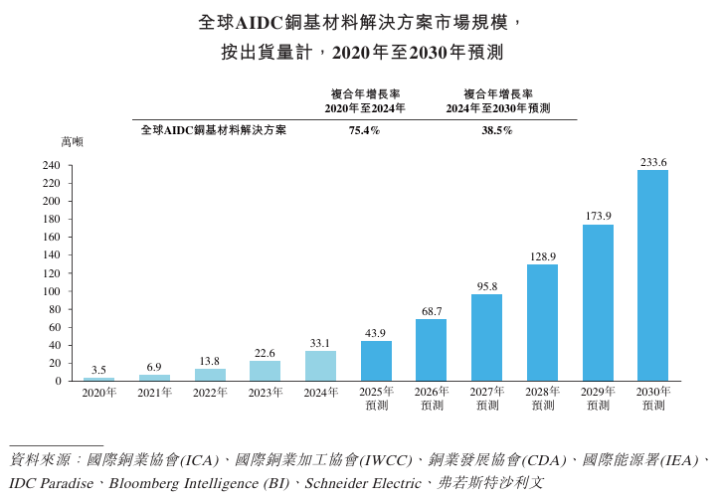 AIDC铜基材料解决方案是实现高功率算力设备高效散热与稳定供电的关键支撑。AIDC铜基材料解决方案的全球市场随着AI算力需求的爆发式增长而快速扩张。2020年,全球AIDC铜基材料解决方案市场规模约为3.5万吨,2024年增长至33.1万吨,复合年增长率高达75.4%;在AI算力资本投入加速与液冷技术渗透深化的驱动下,预计至2030年市场规模将达至233.6万吨,复合年增长率约为38.5%。