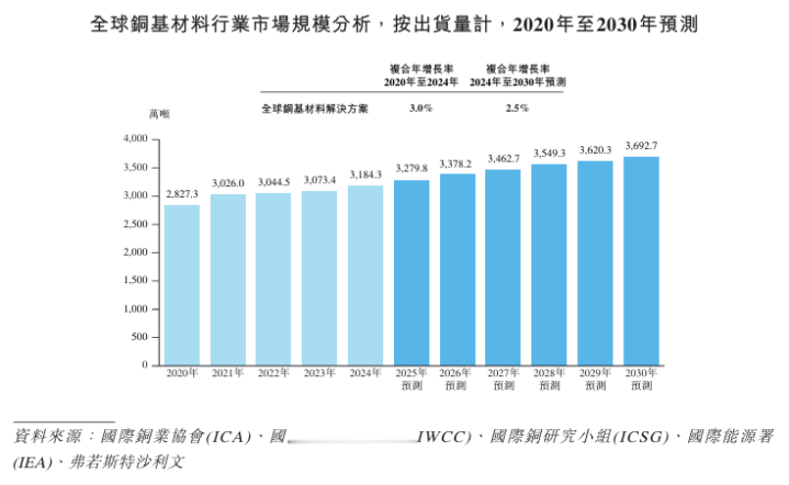 铜基材料的市场需求与宏观经济状况息息相关。在基础应用领域保持稳定发展、新兴应用领域强势拓展的驱动下,全球铜基材料行业整体呈现持续增长态势。全球铜基材料行业市场规模由2020年的约2,827.3万吨增长至2024年的约3,184.3万吨,期间复合年增长率为3.0%。在5G通讯、AI技术等新兴领域的驱动下,市场对高端铜基材料的需求持续攀升,预计至2030年全球市场规模将达到3,692.7万吨,2024年至2030年间复合年增长率为2.5%。