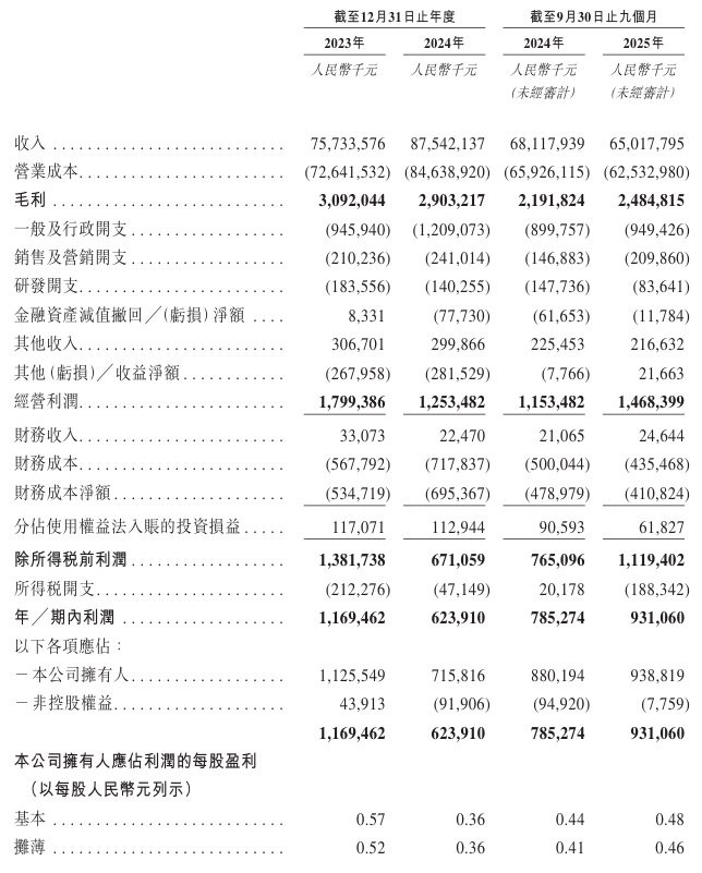 于2023年度、2024年度、2024年截至9月30日止九个月、2025年截至9月30日止九个月,公司录得毛利分别约30.92亿元、29.03亿元、21.92亿元、24.85亿元,对应毛利率分别为4.1%、3.3%、3.2%、3.8%。