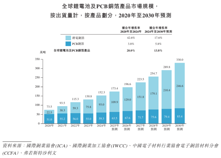 在新能源汽车市场持续扩张、储能系统大规模部署以及智能设备需求上升的拉动下,按出货量计,锂电铜箔市场规模从2020年的22.5万吨跃升至2024年的93.0万吨,期间复合年增长率为42.6%,预计2030年将达到246.6万吨,2024年起复合年增长率约为17.6%。而PCB铜箔则依托5G通讯、AI算力等对高频高速电路的升级需求,按出货量计,其市场规模从2020年的51.0万吨上升至2024年的59.3万吨,复合年增长率为3.8%,2030年将有望达到83.4万吨,复合年增长率约为5.8%。