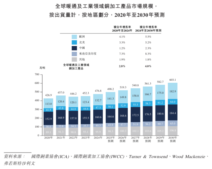 2020年,全球暖通及工业领域铜加工产品市场规模约为426.9万吨,至2024年增长至约476.8万吨,2020年至2024年间复合年增长率为2.8%;预计在能效标准升级、设备更新换代及建筑节能改造持续推进等因素驱动下,2030年市场规模有望达到603.1万吨,2024年至2030年间复合年增长率为4.0%。