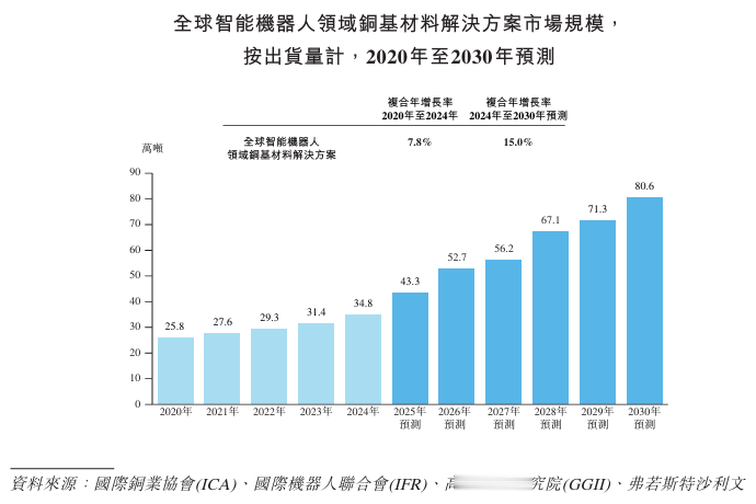 铜基材料解决方案是支撑智能机器人高功率驱动系统稳定供能与整机高效热管理的关键基础,其出货量随着其产业化进程加速而逐步放量。2020年,按出货量计,全球智能机器人领域铜基材料解决方案市场规模约为25.8万吨,2024年增长至34.8万吨,复合年增长率为7.8%;在算力配置提升、关节驱动功率持续上行以及规模化量产推进的带动下,预计至2030年市场规模将达至80.6万吨,复合年增长率约为15.0%。